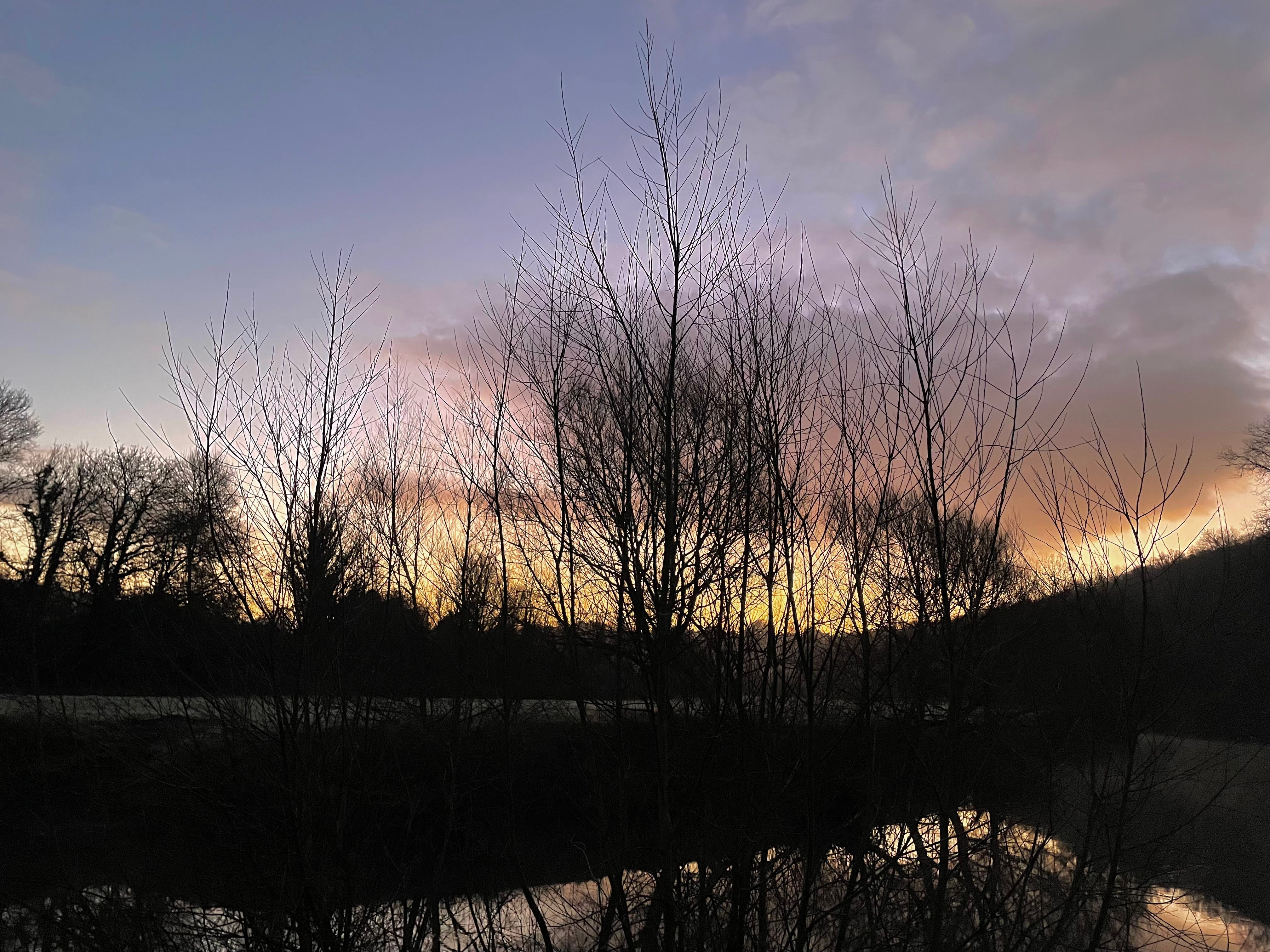 Still and dark Cold and quiet Just one star. I fumble for the kissgate latch pray for “All my Relations” follow the feel underfoot along the invisible path “Walking the Green Earth”. What’s this old man doing, wandering about in the dark? You ask about beauty I tell you, “Right here”. A quiet, cold beauty River a highway of light blackness of the shadows trees rise against the sky skeletal reflections on the water house lights on the hill and this dark, quiet wildness. Am I settled in this still silence Or waiting for something to happen? No birds move, nor mammals scarcely a sound. Nothing to do except eat my slender breakfast. But when I've drunk my tea and eaten my mince pie, what then? What do I sit with? Form is emptiness and emptiness is form. Form is precisely emptiness and emptiness precisely form. Or, as the ferryman whispered in Siddhartha’s ear, “Om”. A quarter past seven. a just-about-pink in the east. Suddenly, I can see my feet, the texture of the bank as it drops away from me, the loom of the bridge. Jackdaws chattering now, a few ducks a hint of brown in the trees ripples on the water. I rise to leave Give thanks – “All my Relations”. Walking back across the now-visible path I turn to watch colour spread across the sky.