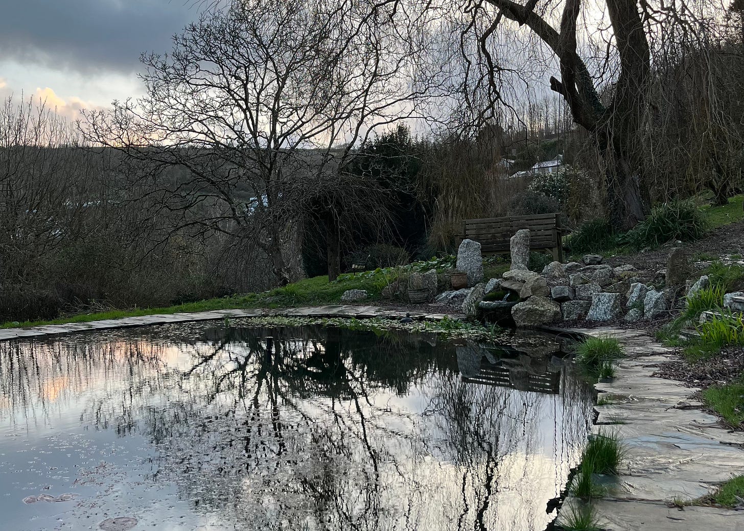 It's a cold late afternoon I'm building steps below my office cabin. And pretty much finished. So I sit on the bench I made last week. Suddenly aware that I’m turning up! Called to take in what's around. Tall weeping willow spreads arms wide Lordly green being, you welcome my presence….. Bare branches dangle and sway on the breeze. I see a Green Man in the bark. Beyond this…. River. Wind-shadow catspaws gust downstream. A great carrion crow sits in the walnut tree Notices me, flaps to the apple tree. His mate follows: walnut…. Apple I sense a weird mutual interest. They fly off… Five hen pheasants come to drink at the pond Wary eyes watch and wait Hoping this human has grain. I've never seen them come to drink. But never do I sit like this. Here. Allowing beauty not to pass me by. Lord Willow reminds me of something that goes: Don't search for meaning Only sing and dance fully In being alive. I savour this Monkey-minding it SHIFTing into the senses. Seeing hearing feeling touching smelling…. what? So I linger; take photos. What do I feel? I feel grateful. Amazed at the land and River. Astonished to spend so much of life Not noticing how I walk in beauty.
